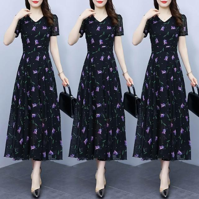 短袖雪紡連衣裙2026年夏季新款V領剪花氣質顯瘦大擺中長款沙灘裙