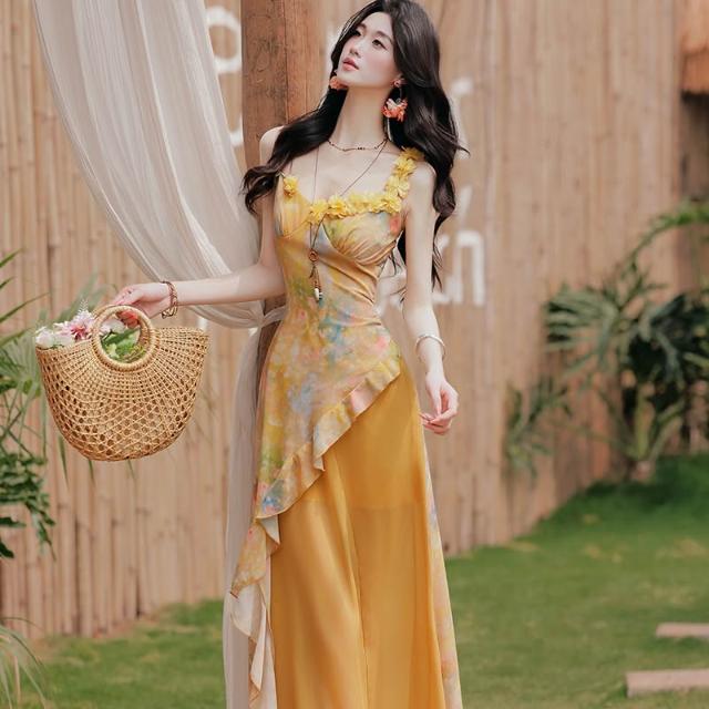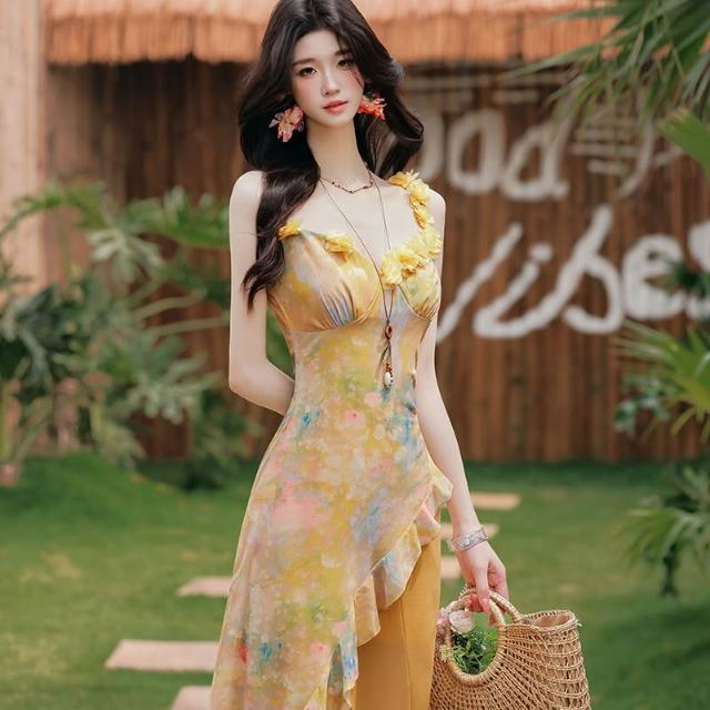 實拍 海邊度假黃色連衣裙明媚藝術生穿搭雪紡吊帶長裙