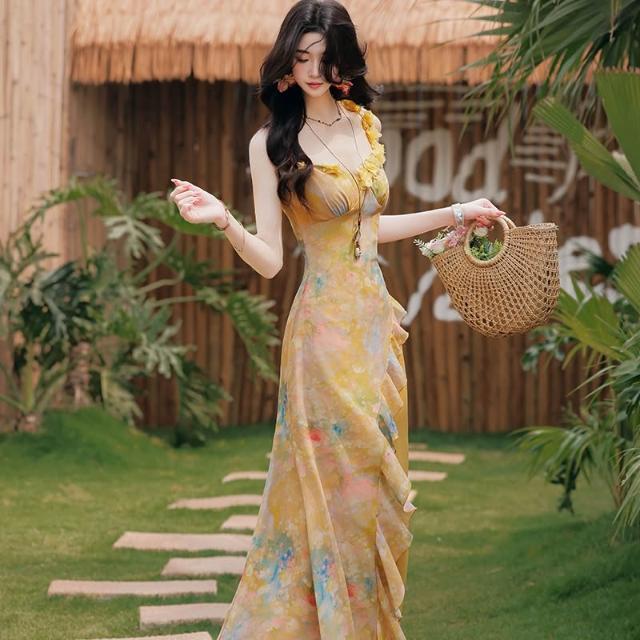 實拍 海邊度假黃色連衣裙明媚藝術生穿搭雪紡吊帶長裙