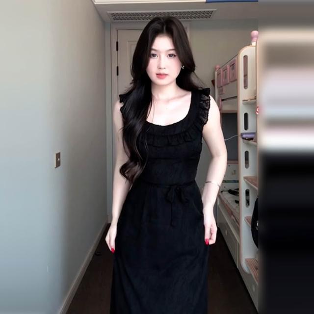 黑色v領小飛袖連衣裙子女裝夏季2025新款法式高級感氣質雪紡長裙