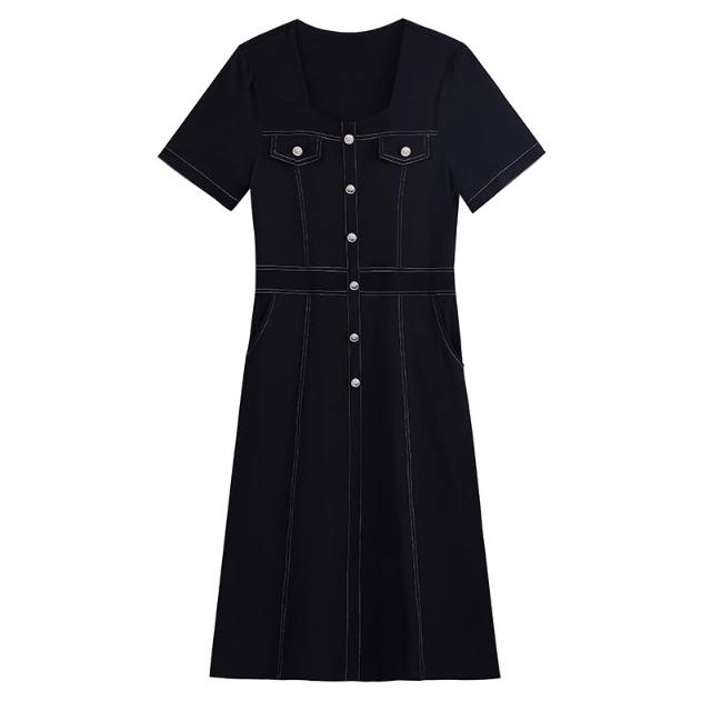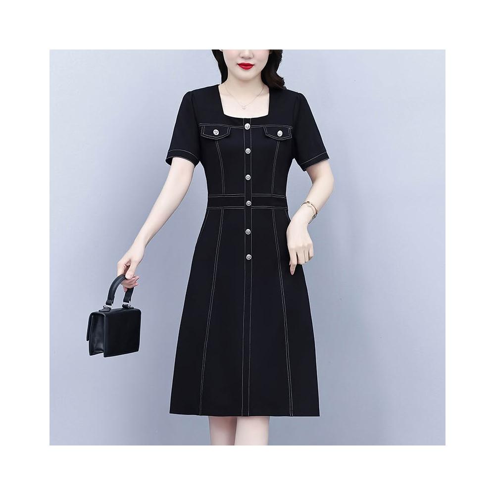 大碼減齡連衣裙女2026年夏季新款方領氣質高級感遮肚顯瘦小黑裙