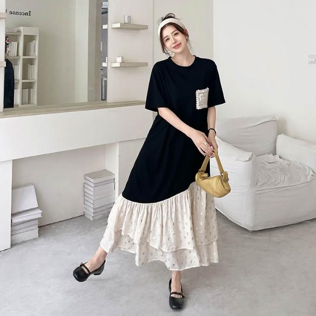 實拍 2026夏新款/長款大碼顯瘦不規則拼接重工鉤花口袋短袖連衣裙