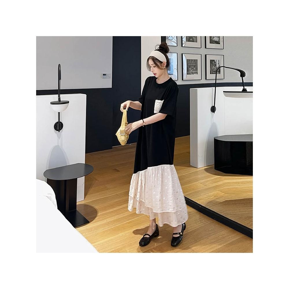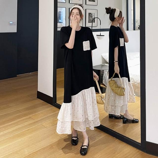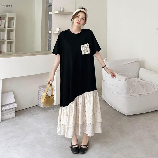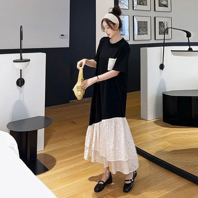 實拍 2026夏新款/長款大碼顯瘦不規則拼接重工鉤花口袋短袖連衣裙