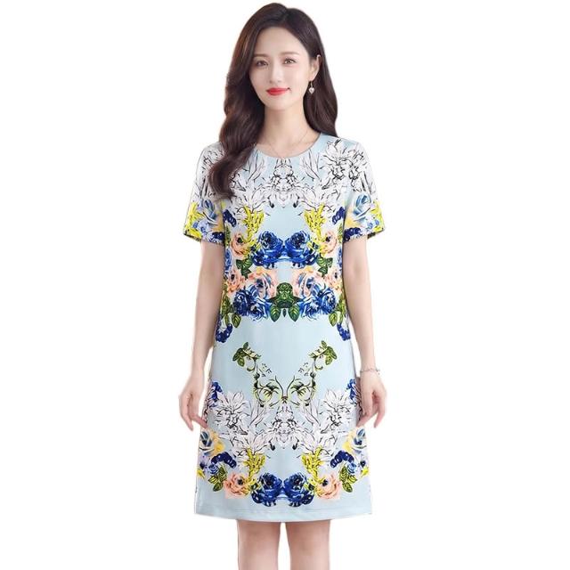 唯美風時尚藍色玫瑰定位印花裙2026夏季女裝高級感舒適釘珠連衣裙
