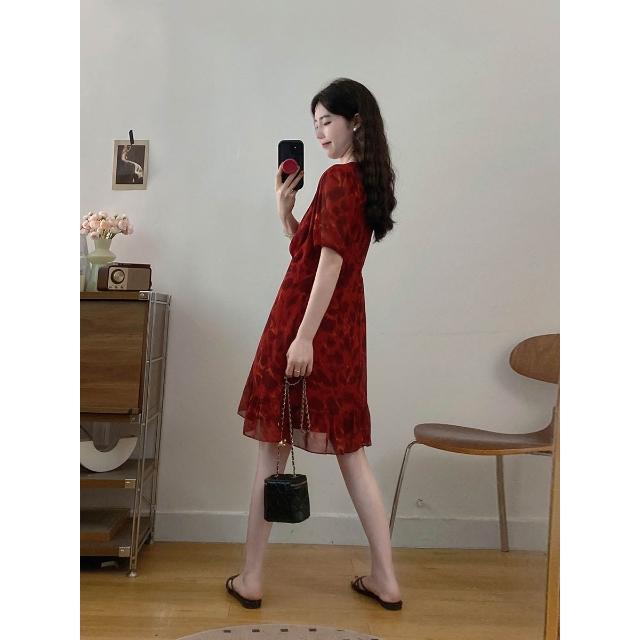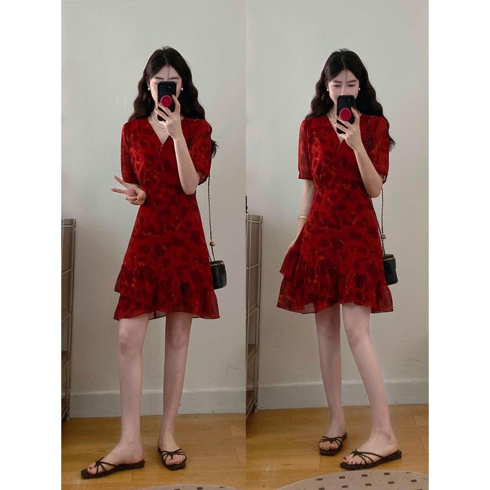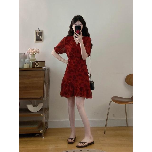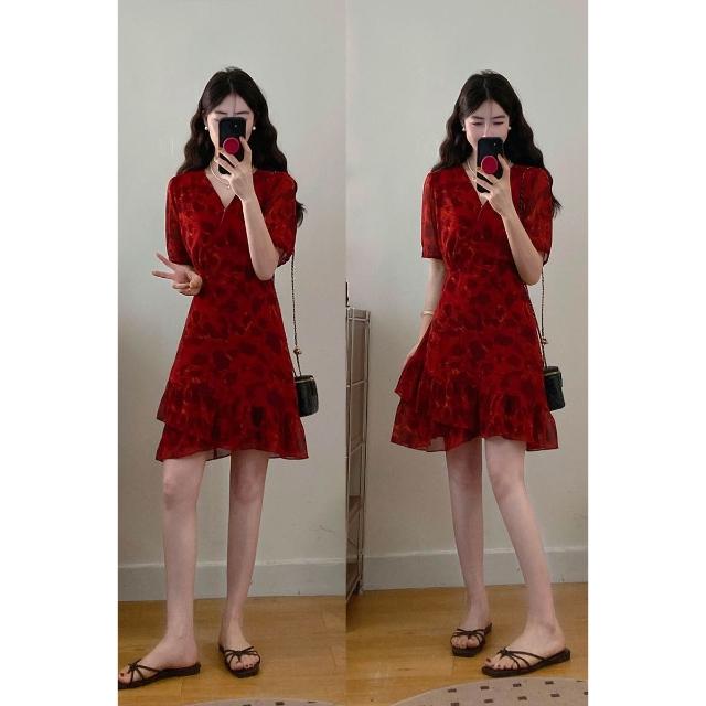 實拍~大碼女裝法式紅色氣質碎花連衣裙胖MM夏季漂亮短裙藏肉顯瘦