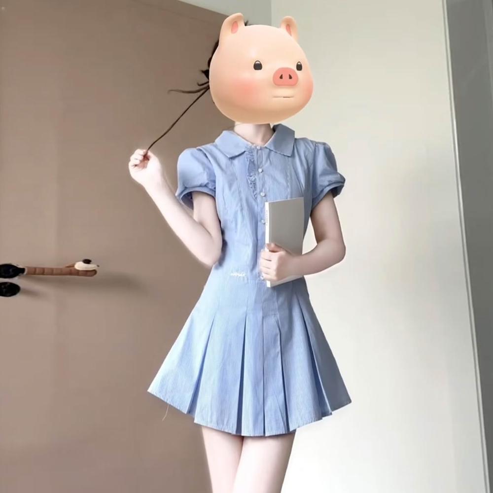 2025夏季新款學院風格紋襯衫短袖連衣裙子收腰泡泡袖百褶短裙套裝
