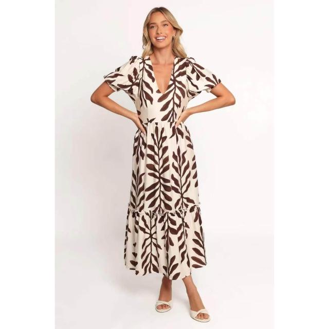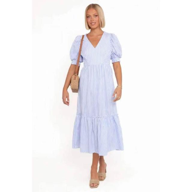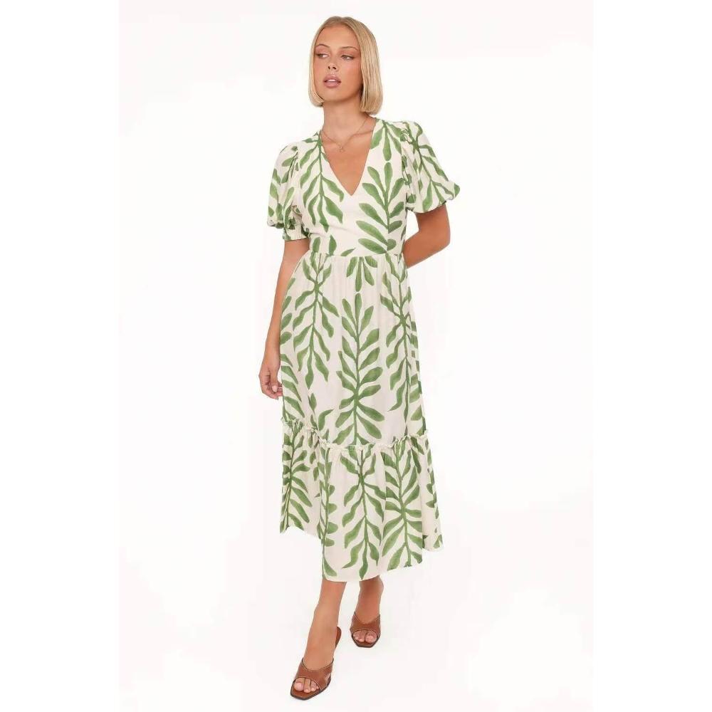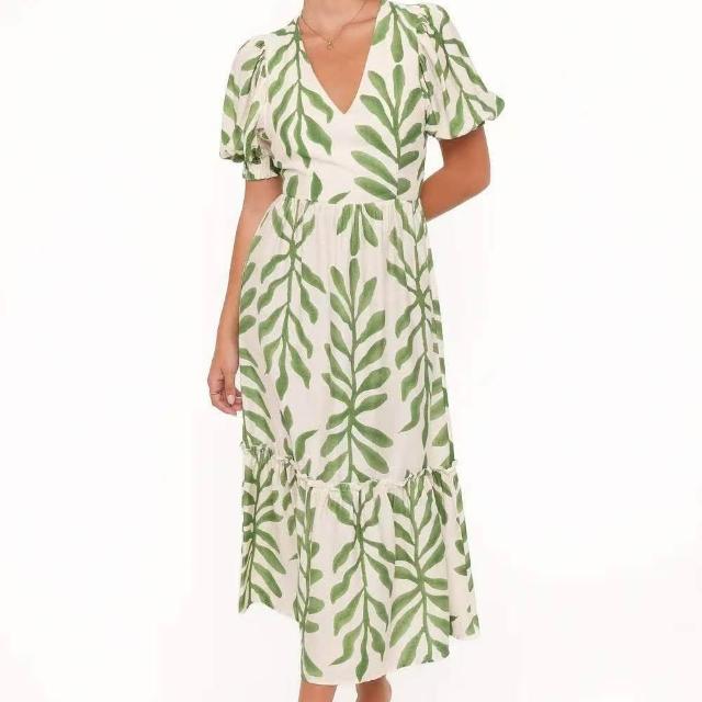 2026歐美時尚度假風 夏季泡泡短袖V領連衣裙女裝
