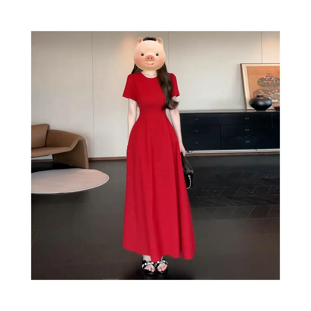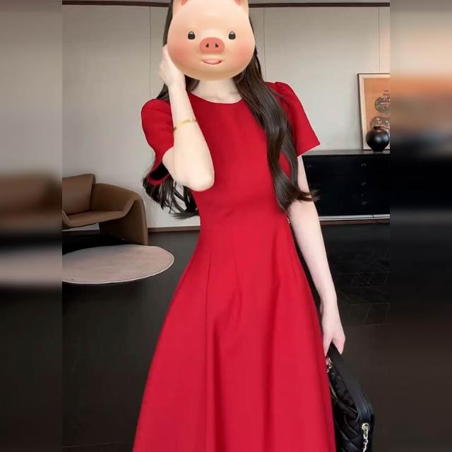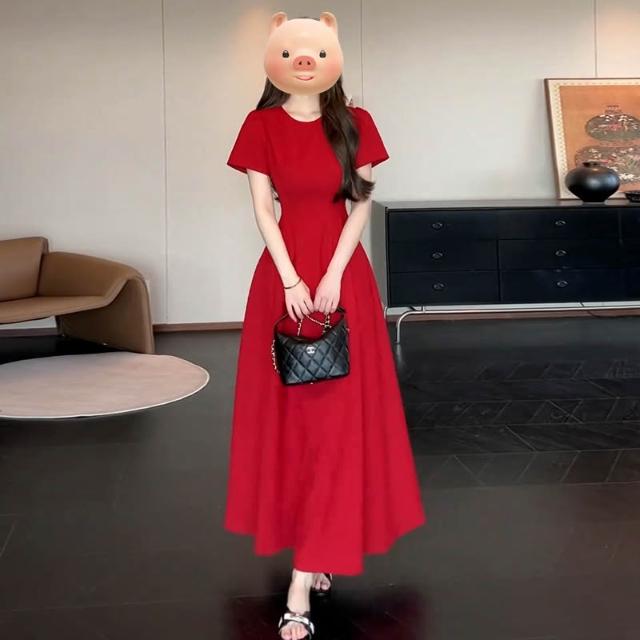 法式復古紅色短袖連衣裙子女夏季2025新款爆款氣質高級感收腰長裙