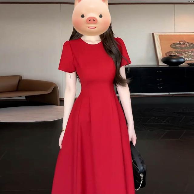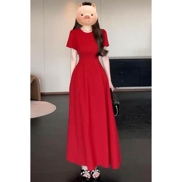 法式復古紅色短袖連衣裙子女夏季2025新款爆款氣質高級感收腰長裙