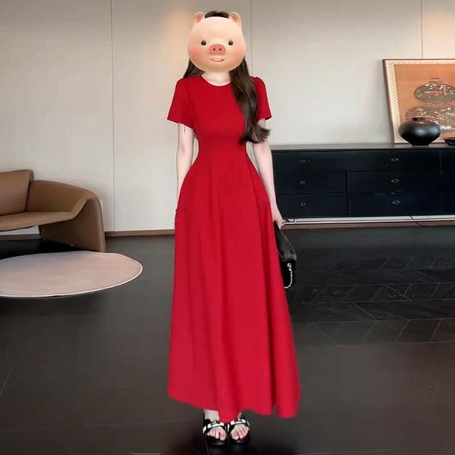 法式復古紅色短袖連衣裙子女夏季2025新款爆款氣質高級感收腰長裙