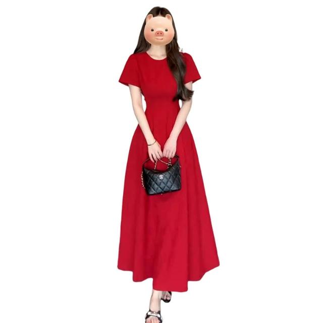 法式復古紅色短袖連衣裙子女夏季2025新款爆款氣質高級感收腰長裙