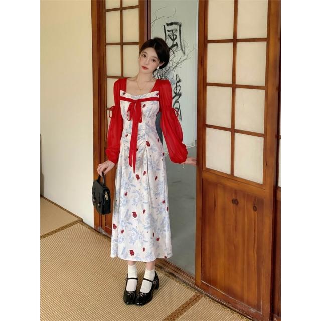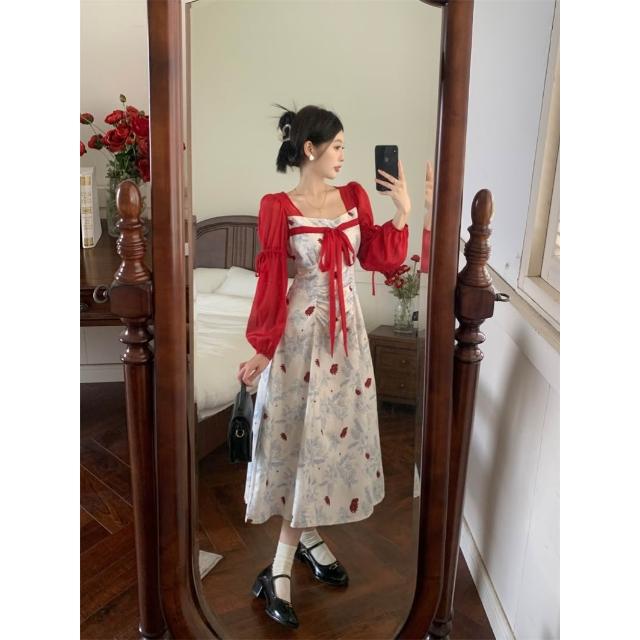 復古新中式女裝連衣裙2026春季新款方領雪紡長袖遮肚顯瘦長款裙子