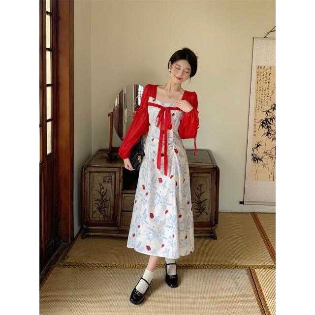 復古新中式女裝連衣裙2026春季新款方領雪紡長袖遮肚顯瘦長款裙子