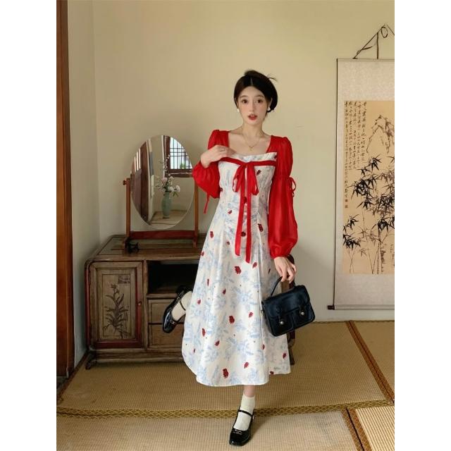 復古新中式女裝連衣裙2026春季新款方領雪紡長袖遮肚顯瘦長款裙子