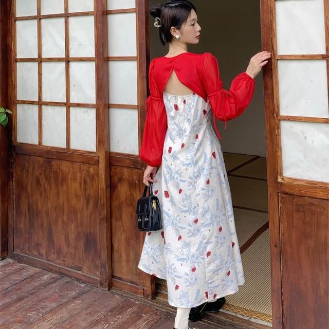 復古新中式女裝連衣裙2026春季新款方領雪紡長袖遮肚顯瘦長款裙子