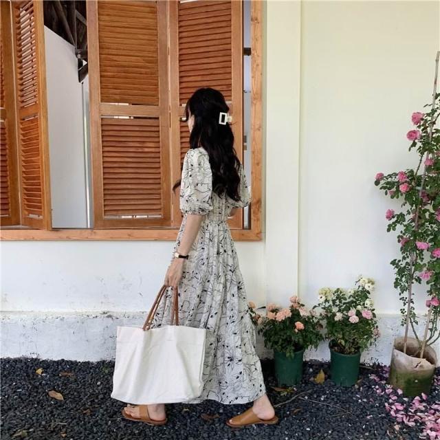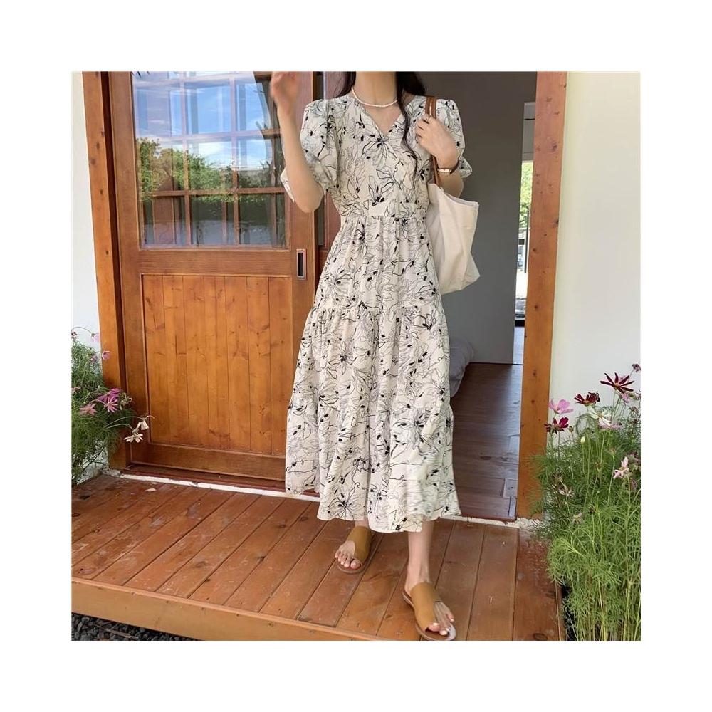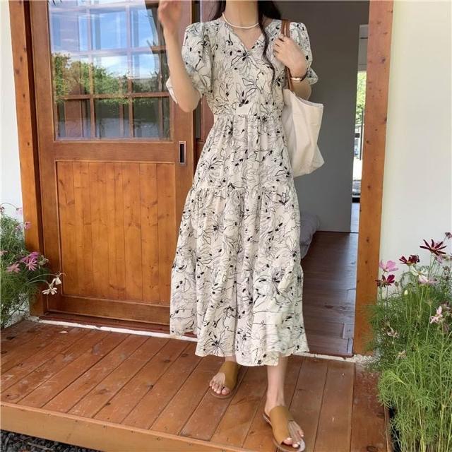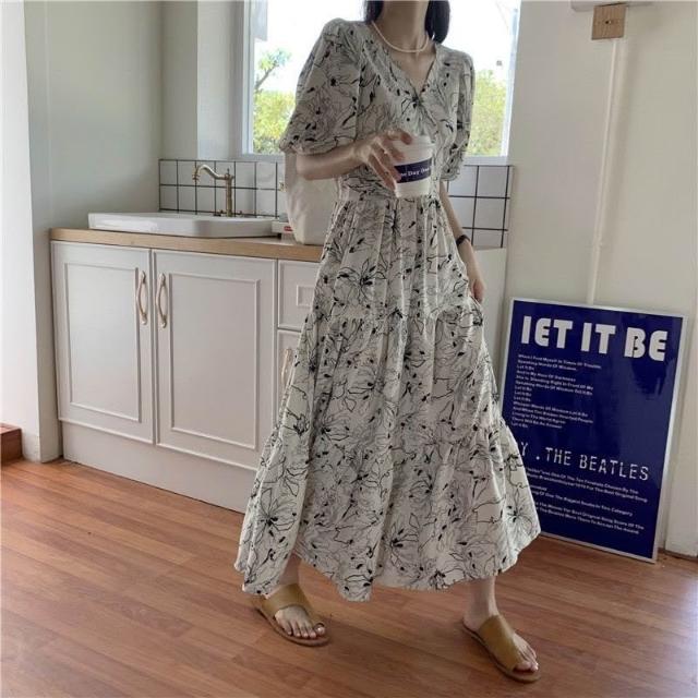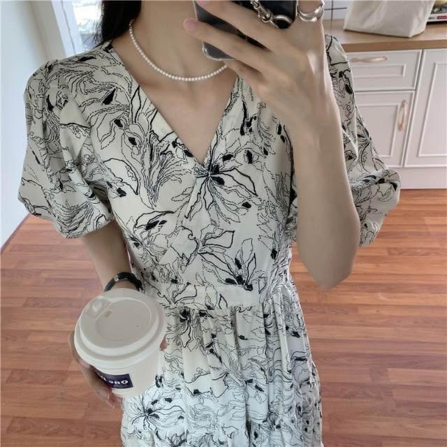 2026新款韓版長款連衣裙V領長款水墨畫印花收腰大擺連衣裙