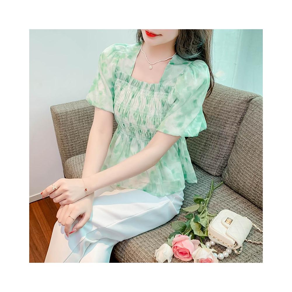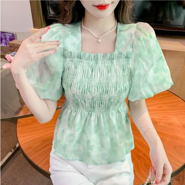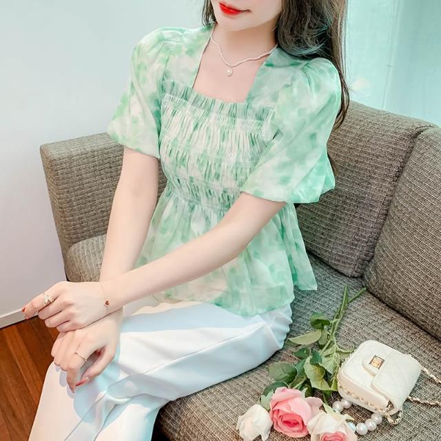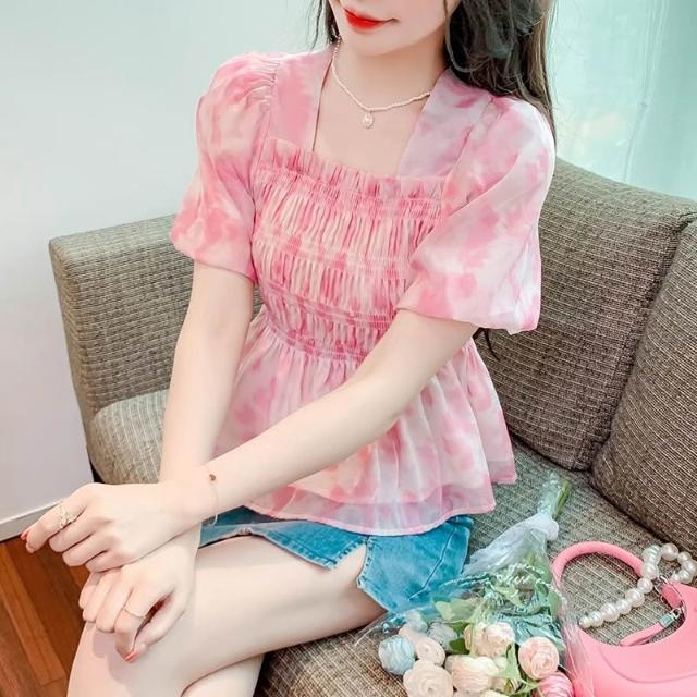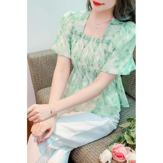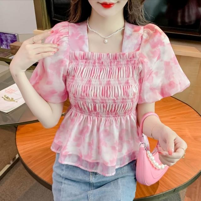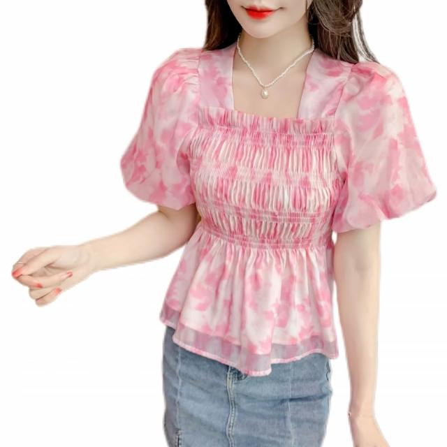 2026夏季新款法式甜美紫色碎花雪紡女士襯衫方領泡泡短袖收腰上衣