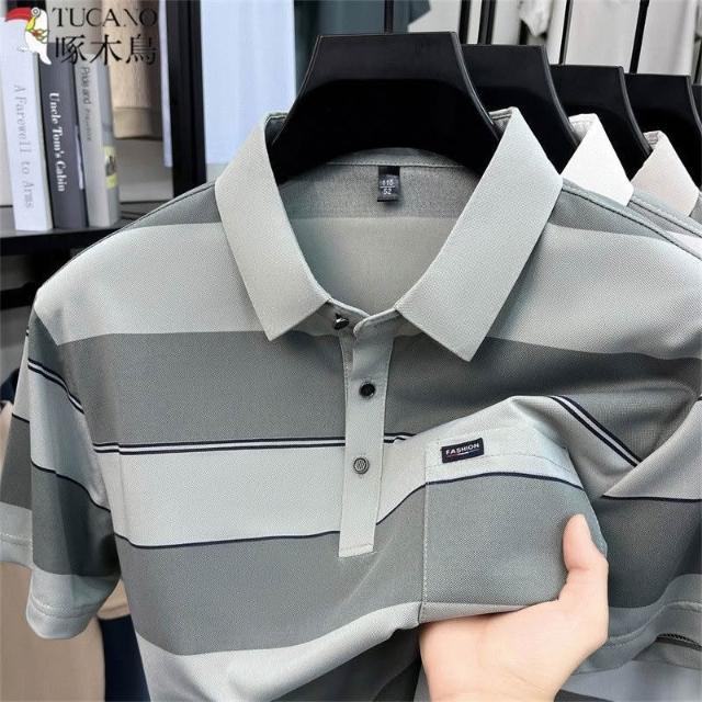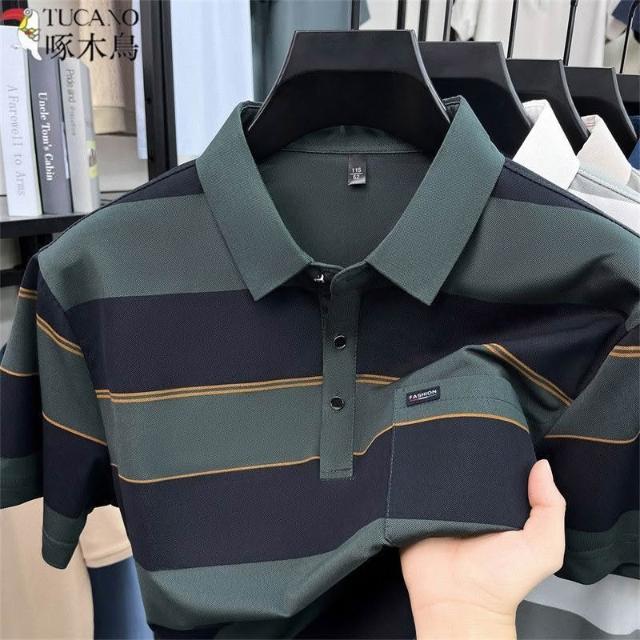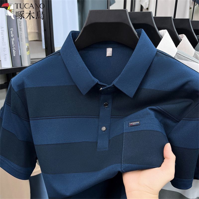 啄木鳥短袖t恤男士夏季中年休閒條紋半袖真口袋翻領涼爽POLO衫T