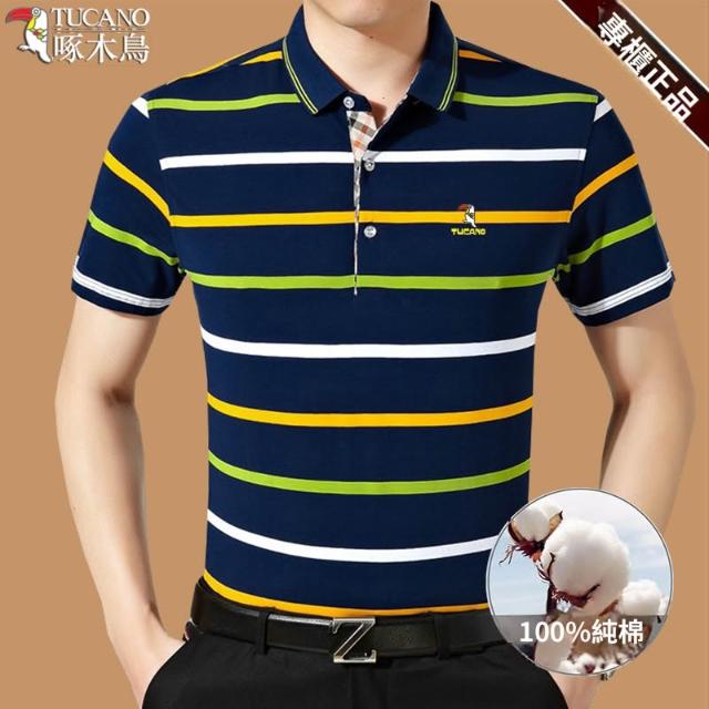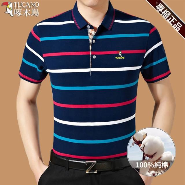啄木鳥正品短袖純棉T恤男士翻領條紋半袖POLO衫中年大碼爸爸裝棉t