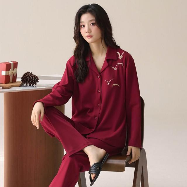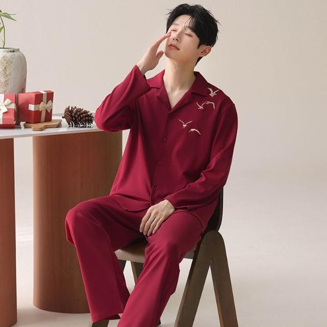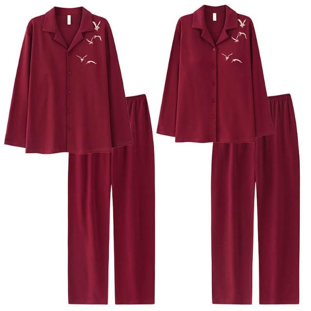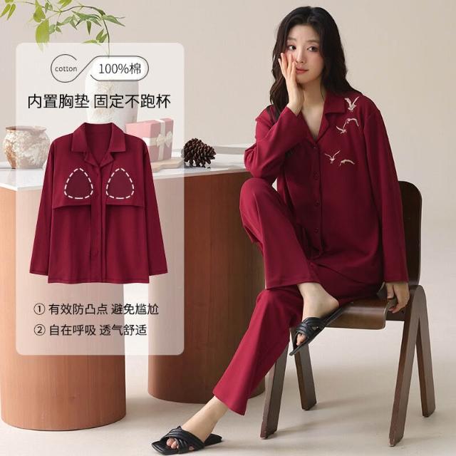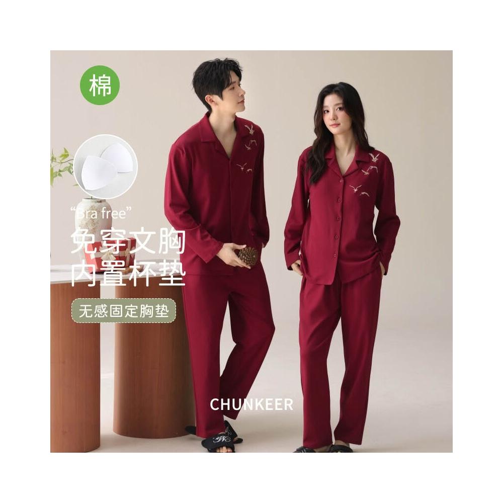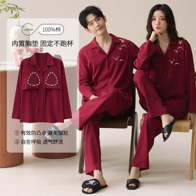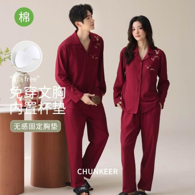 免税 秋冬季新婚長袖女款帶胸墊情侶睡衣純棉紅色開衫男士家居服兩件套