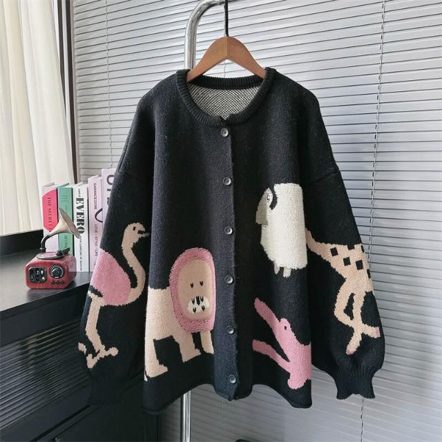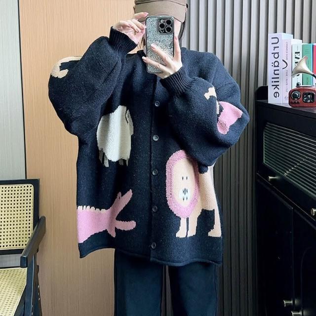免税 2025秋冬新款重工卡通提花慵懶風毛衣外套女寬松大版圓領針織開衫