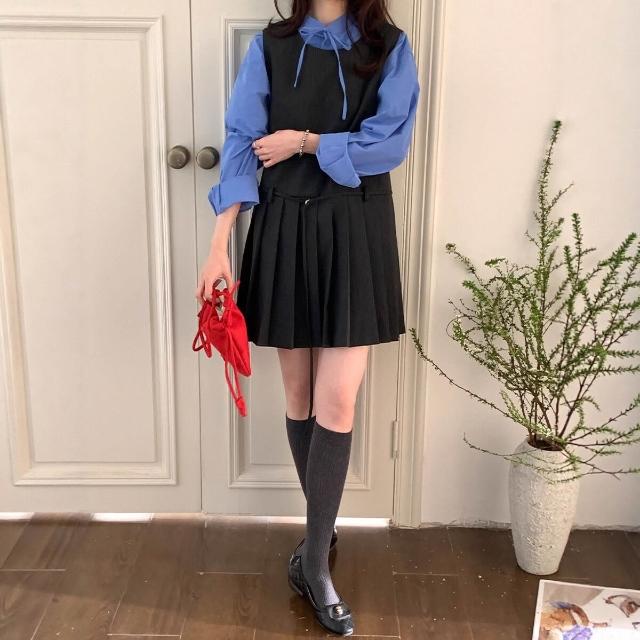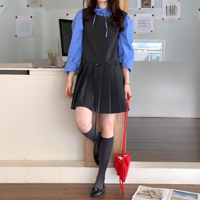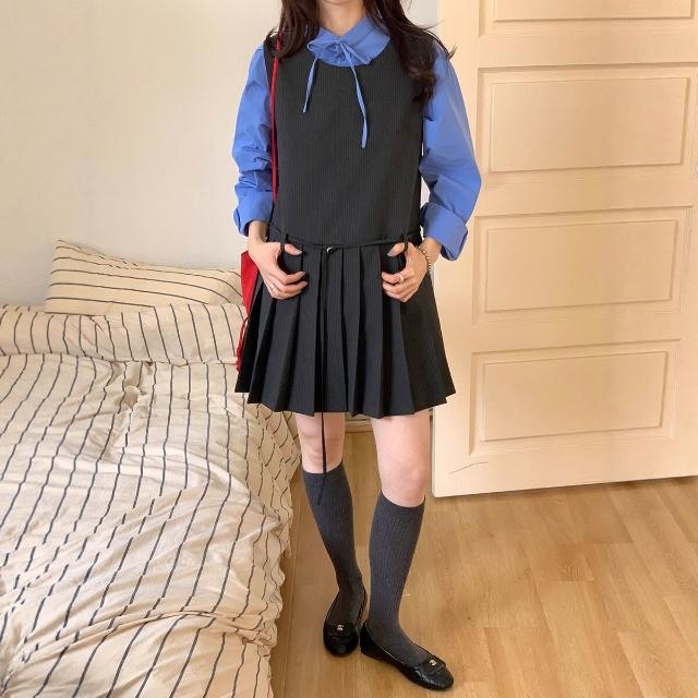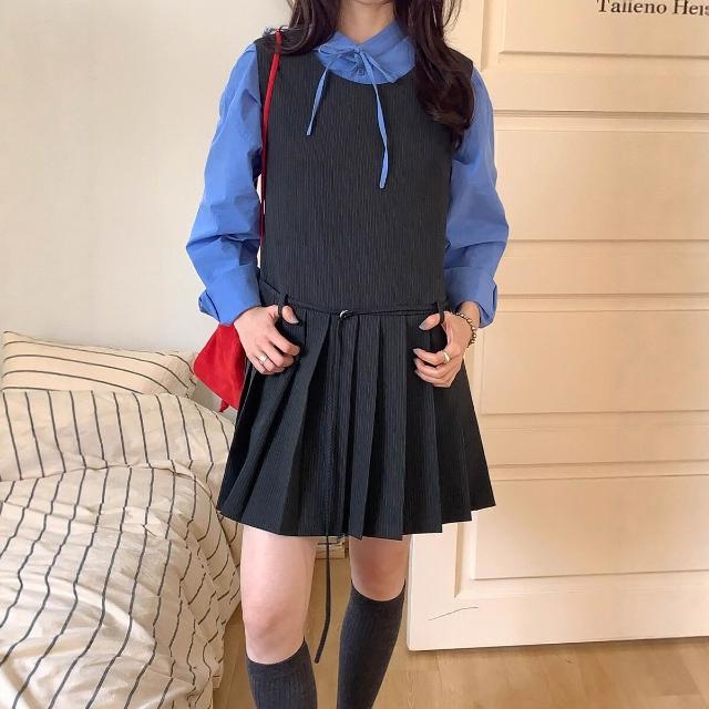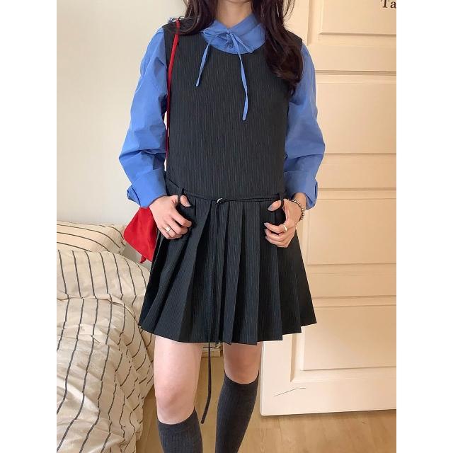 免税 miu系學院風減齡條紋無袖連衣裙女秋季2025新款韓系百褶背心裙子