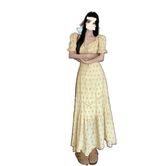 免税 大碼法式碎花連衣裙女裝夏季方領收腰茶歇裙胖MM遮肚顯瘦初戀裙子