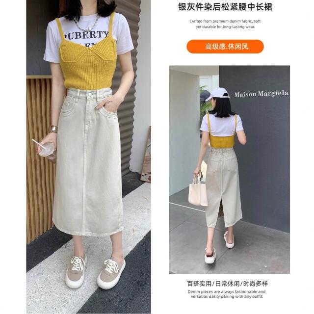 免税 高腰後開叉半身裙女2025夏高腰顯瘦顯腿長銀灰件染後松緊腰中長裙
