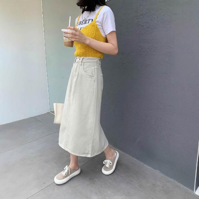 免税 高腰後開叉半身裙女2025夏高腰顯瘦顯腿長銀灰件染後松緊腰中長裙