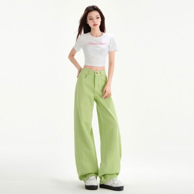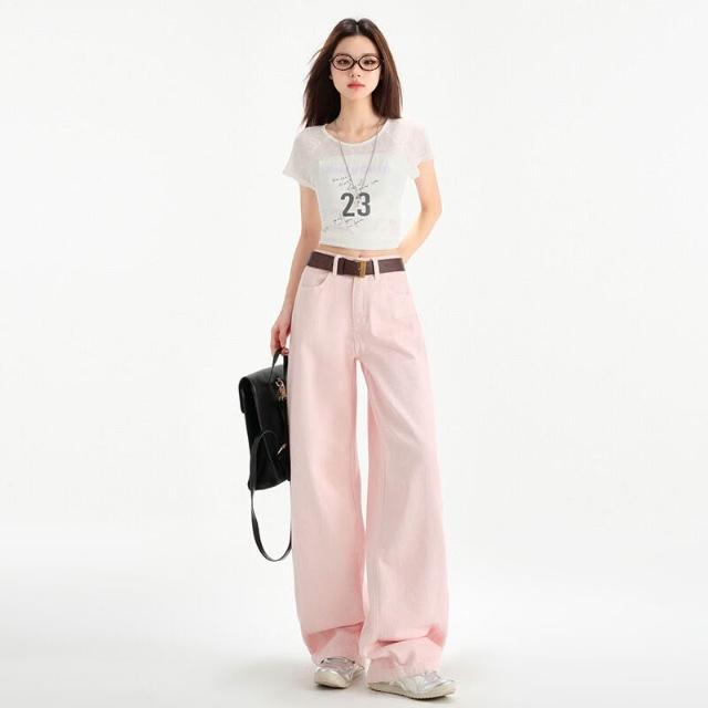 免税 櫻花粉闊腿垂感拖地牛仔褲女2025春夏薄款顯瘦ins潮直筒褲百搭