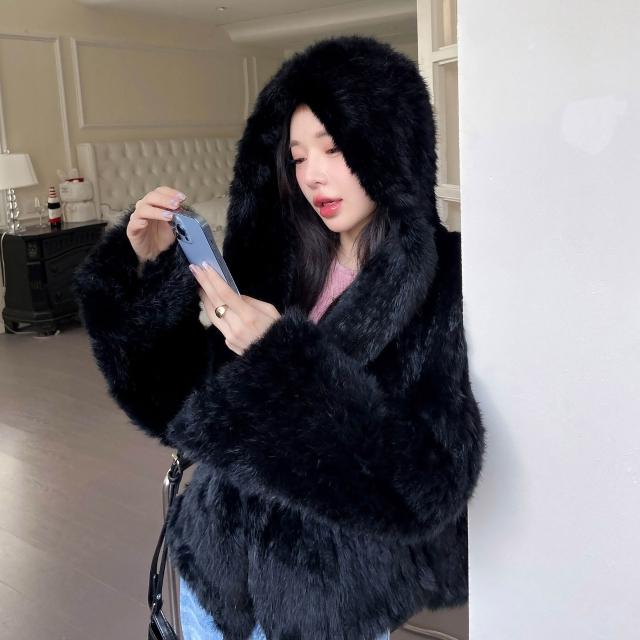 免税 真兔毛外套女秋冬季新款保暖韓版百搭短款連帽子雙面編織皮草上衣