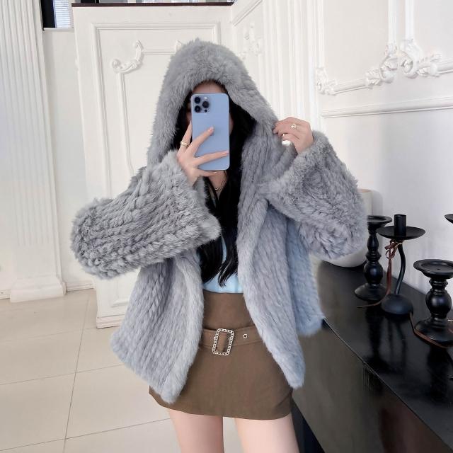 免税 真兔毛外套女秋冬季新款保暖韓版百搭短款連帽子雙面編織皮草上衣