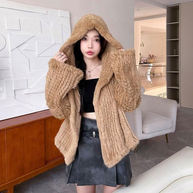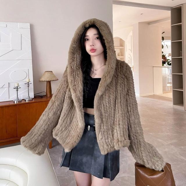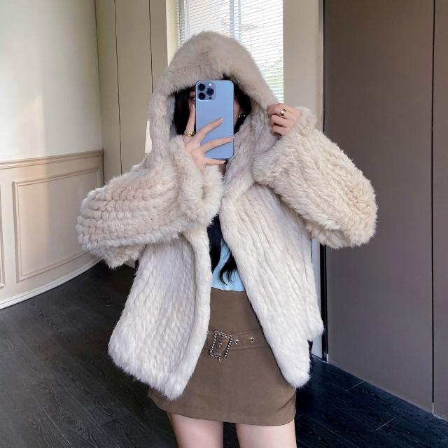 免税 真兔毛外套女秋冬季新款保暖韓版百搭短款連帽子雙面編織皮草上衣