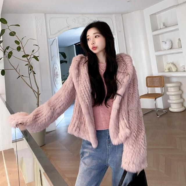 免税 真兔毛外套女秋冬季新款保暖韓版百搭短款連帽子雙面編織皮草上衣