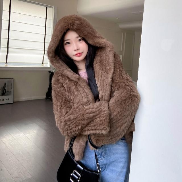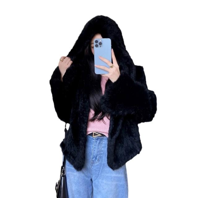 免税 真兔毛外套女秋冬季新款保暖韓版百搭短款連帽子雙面編織皮草上衣
