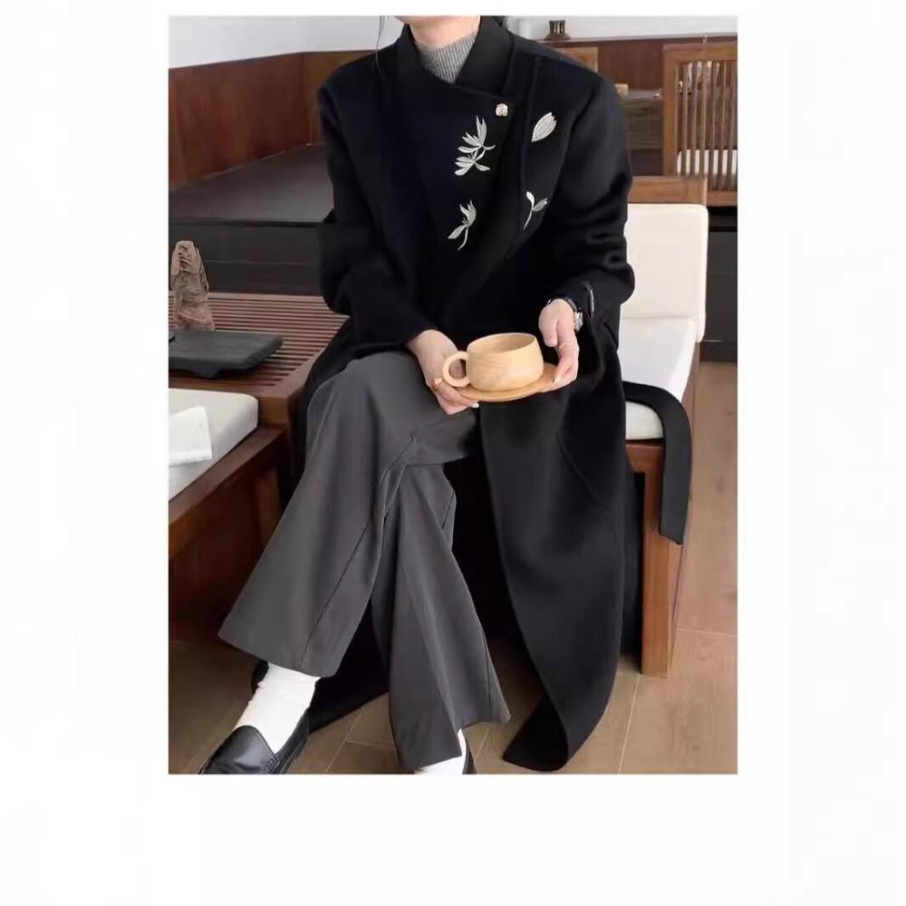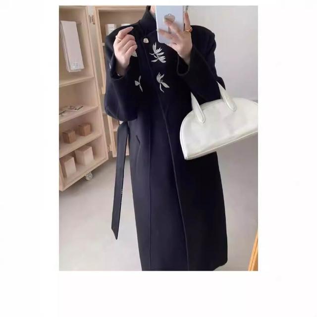 免税 現高級感雙面羊毛大衣女羊毛秋冬氣質新中式國風刺繡毛呢外套