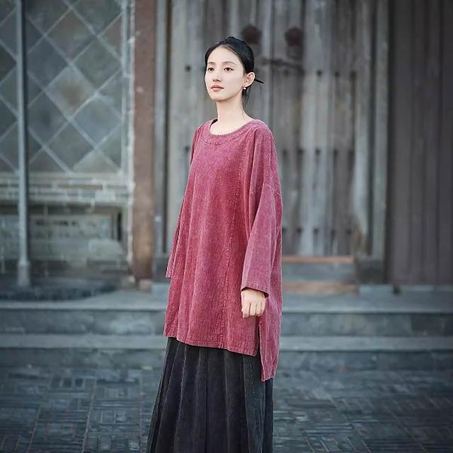 免運 免稅 熱銷🔥 原創文藝套頭炒色設計棉麻復古小衫寬松落肩套頭衫