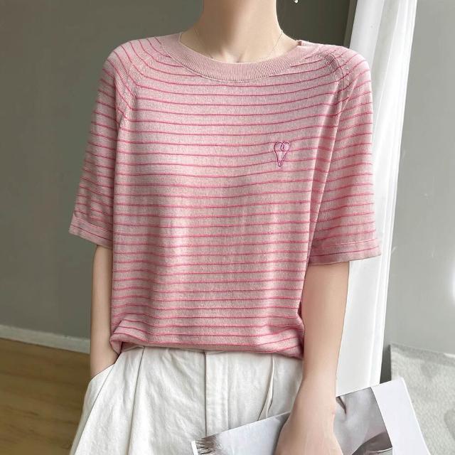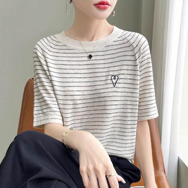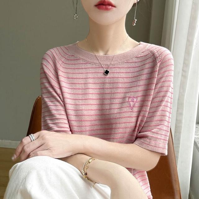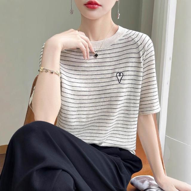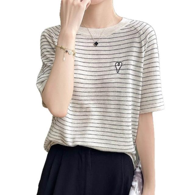 免運 免稅 熱銷🔥 輕薄透氣柔軟桑蠶絲短袖半袖天絲圓領T恤衫女條紋針織插肩袖上衣