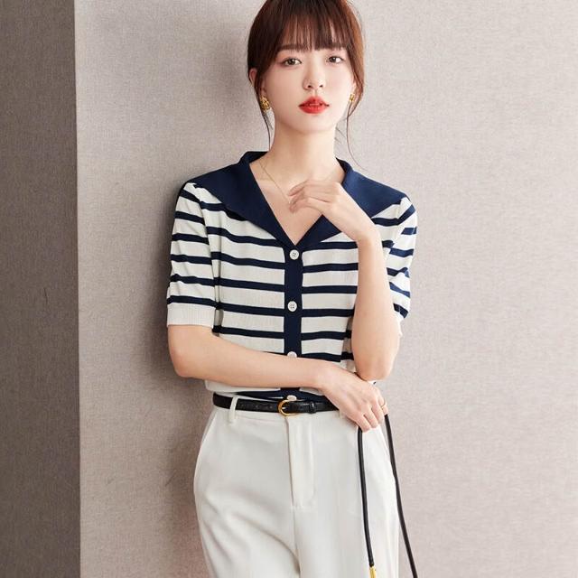免運 免稅 熱銷🔥 藏藍色短袖條紋冰絲針織開衫女夏2025新款海軍領撞色薄款別致上衣