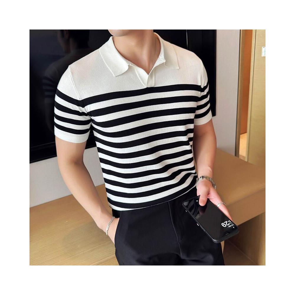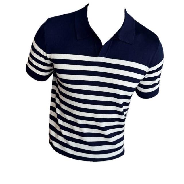 輕簡 夏季新品男士冰絲薄款POLO衫V領針織短袖Polo衫男橫條紋翻領T恤潮 ebb 1c2