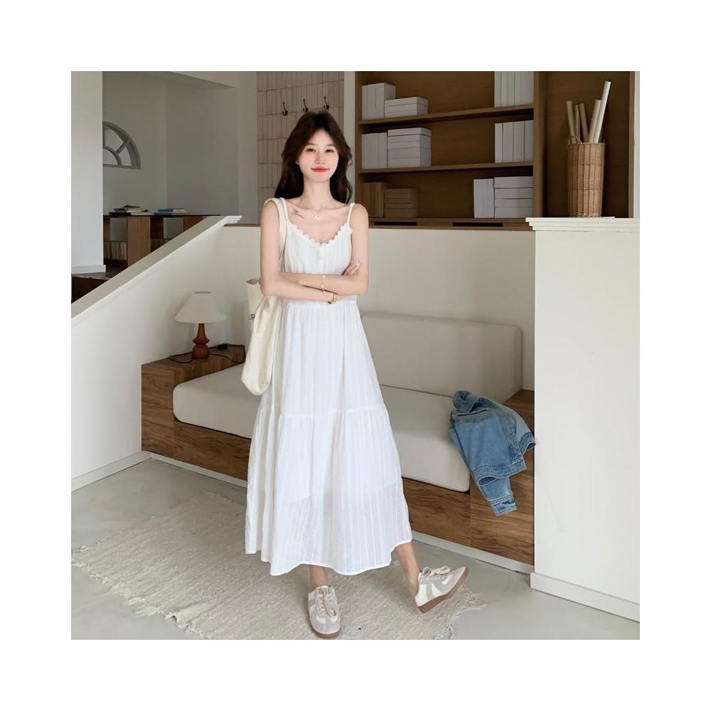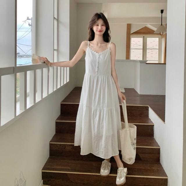 輕簡 米白色花邊拼接吊帶連衣裙女2026夏季新款清純系初戀中長款小裙子 d84