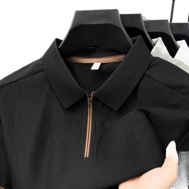 輕簡 夏季新款翻領豎條紋polo衫無痕短袖冰絲速幹薄款拉鏈t恤衫男 104