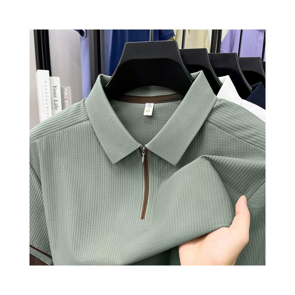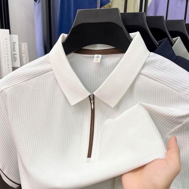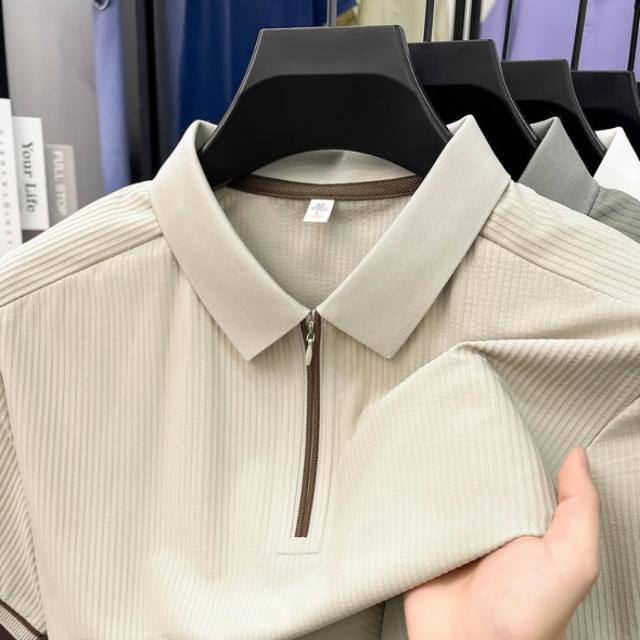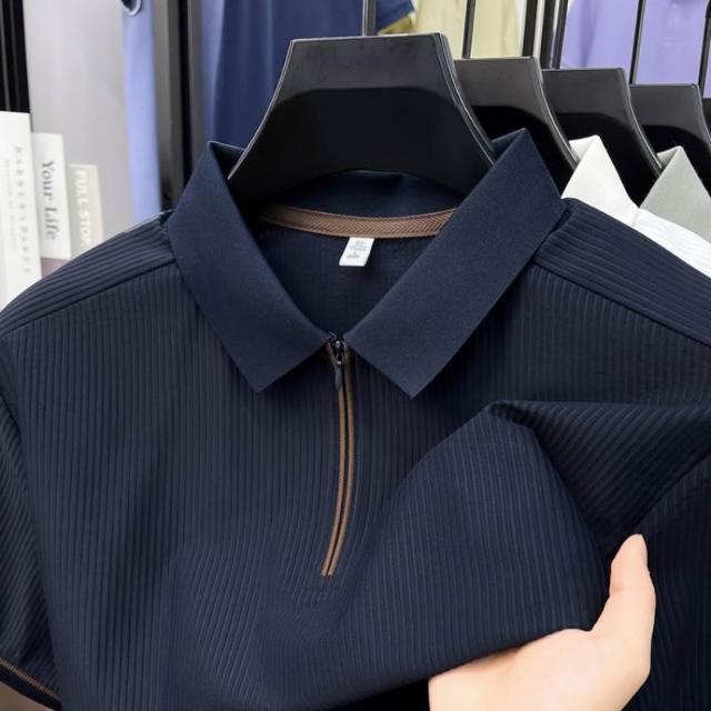 輕簡 夏季新款翻領豎條紋polo衫無痕短袖冰絲速幹薄款拉鏈t恤衫男 104