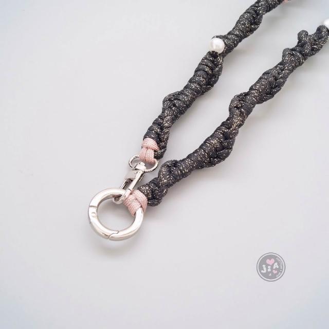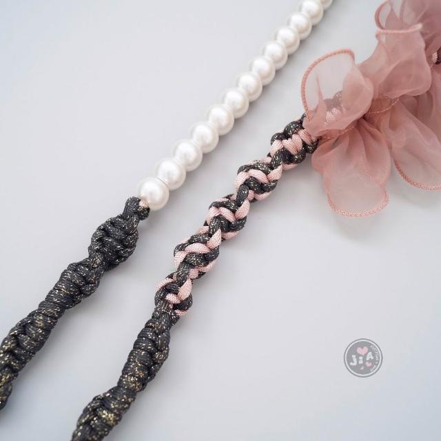 「Jia's」手工編織 網紗 薄紗 荷葉邊 緞帶 蕾絲 編織手機繩 手機掛繩 手機背帶 包包背帶。金蔥黑x粉橘