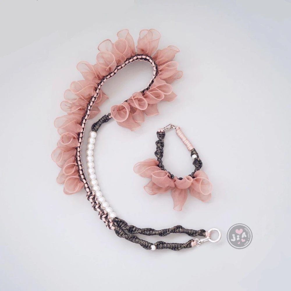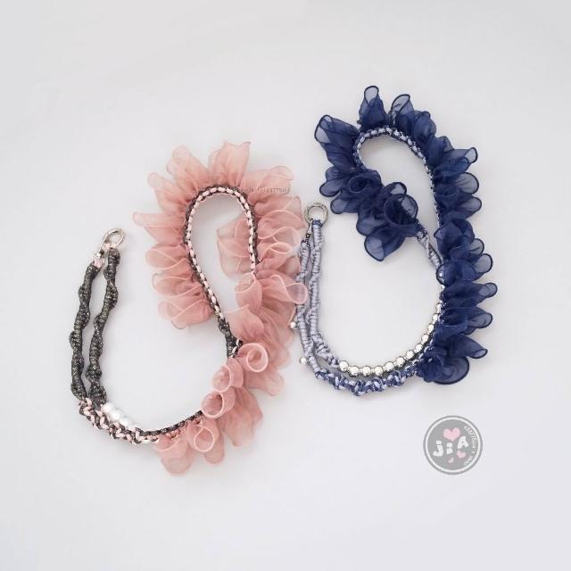 「Jia's」手工編織 網紗 薄紗 荷葉邊 緞帶 蕾絲 編織手機繩 手機掛繩 手機背帶 包包背帶。金蔥黑x粉橘