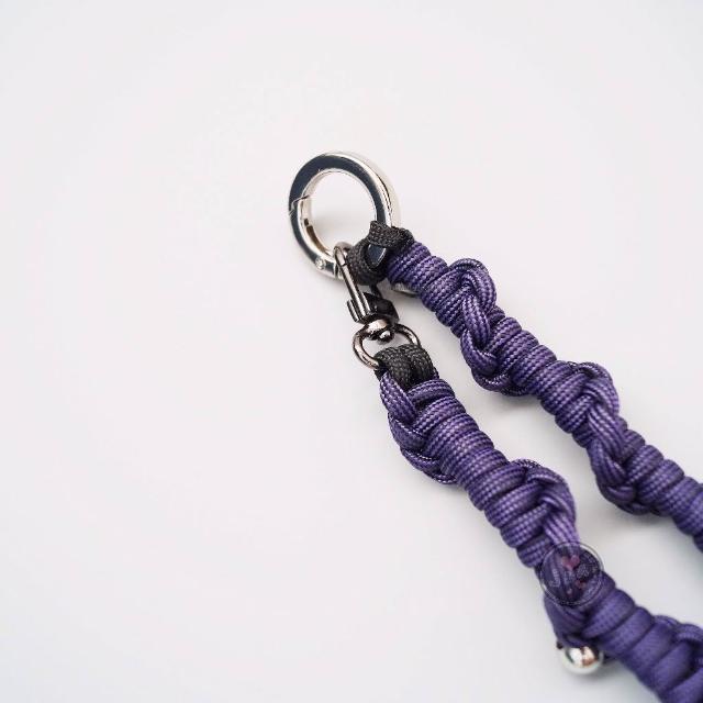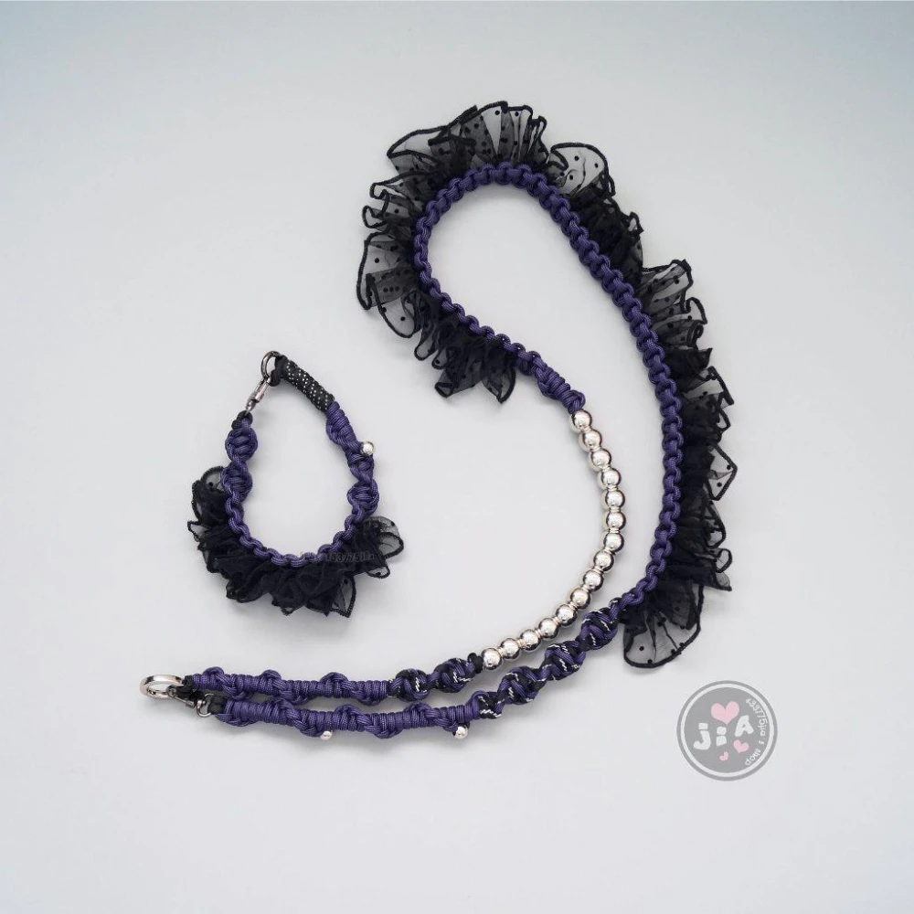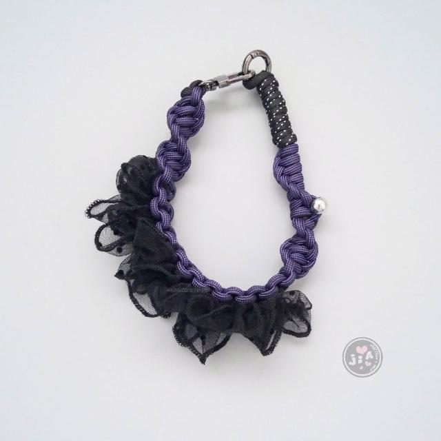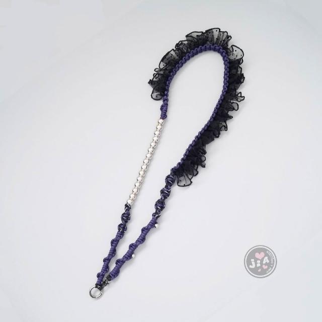 「Jia's」手工編織 網紗 薄紗 荷葉邊 緞帶 蕾絲 編織手機繩 手機掛繩 手機背帶。紫黑格