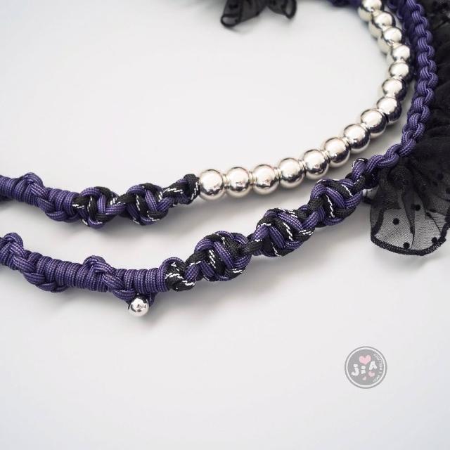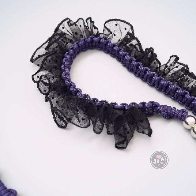 「Jia's」手工編織 網紗 薄紗 荷葉邊 緞帶 蕾絲 編織手機繩 手機掛繩 手機背帶。紫黑格