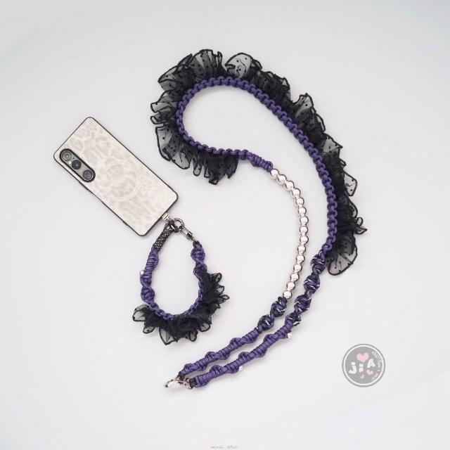 「Jia's」手工編織 網紗 薄紗 荷葉邊 緞帶 蕾絲 編織手機繩 手機掛繩 手機背帶。紫黑格