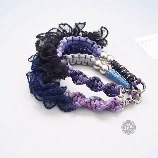 Jia's手工編織 網紗 薄紗 荷葉邊 緞帶 蕾絲 編織手機繩 手機掛繩 手機吊飾 手腕帶。紫x黑/灰x藍