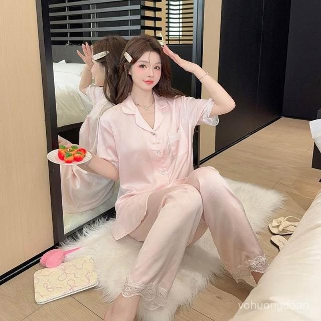 YMX—夏季短袖短褲長褲冰雪絲三件套睡衣女高級蕾絲提花開衫套裝